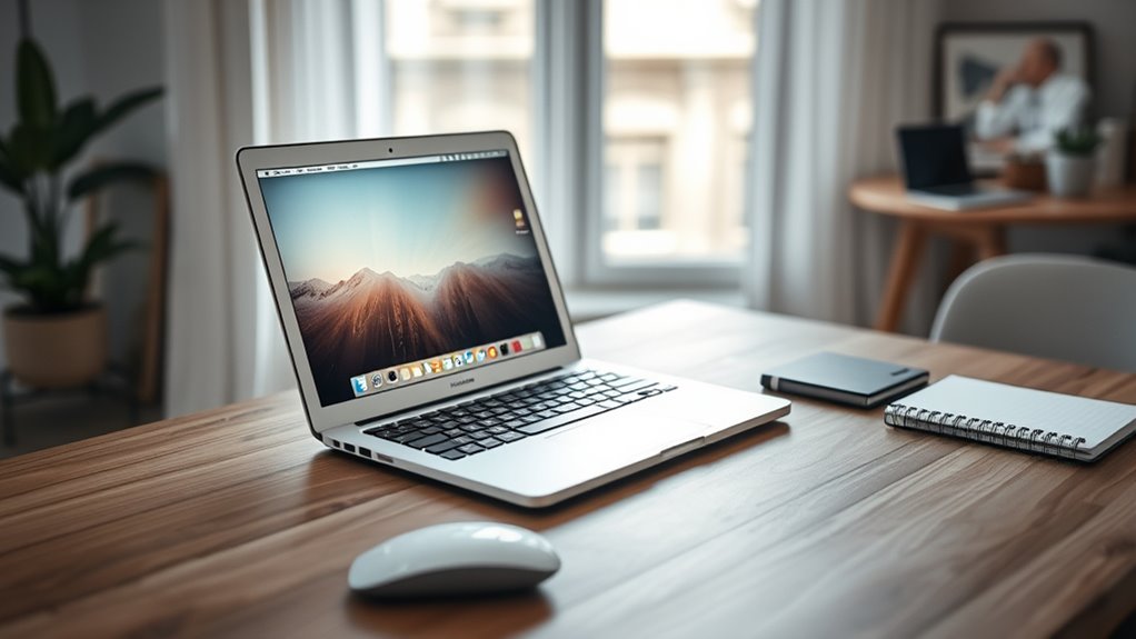 Evaluating your performance needs is essential when selecting a 13-inch MacBook Air configuration. If you handle demanding tasks like video editing or gaming, the M4 chip’s up to 50% faster CPU and four-times GPU performance can make a significant difference. For those who multitask with multiple intensive applications, opting for 16GB or more of unified memory guarantees smooth operation. If your workflow relies on hardware-accelerated video formats such as ProRes or AV1, the M4 chip’s media engines are a valuable advantage. Battery life can also be a key factor—up to 18 hours of usage suits remote work and on-the-go productivity. Ultimately, if you want your device to stay relevant for years, consider higher storage and memory options for future-proofing.