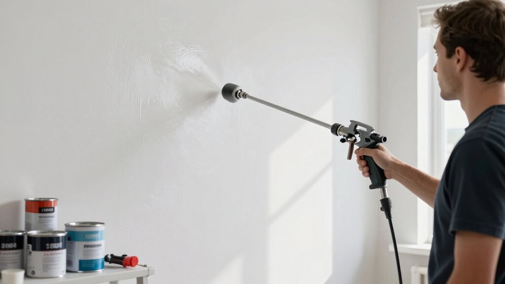 Nozzle flexibility options substantially impact the quality of a smooth wall finish, giving me greater control over paint application. Adjustable spray patterns—horizontal, vertical, or circular—help me target specific areas precisely, ensuring even coverage. Interchangeable nozzles with different orifice sizes let me customize for various paint types and surface textures, making the sprayer versatile. Reversible nozzles are a game-changer for clearing blockages quickly, reducing downtime and maintaining consistent application. Plus, nozzle adjustments influence overspray and coverage, directly affecting the finish’s smoothness. Choosing a sprayer with multiple nozzle options allows me to switch easily between detailed work and broad coverage, tailoring the process to project needs. Overall, nozzle flexibility considerably enhances control, efficiency, and the quality of my wall finish.