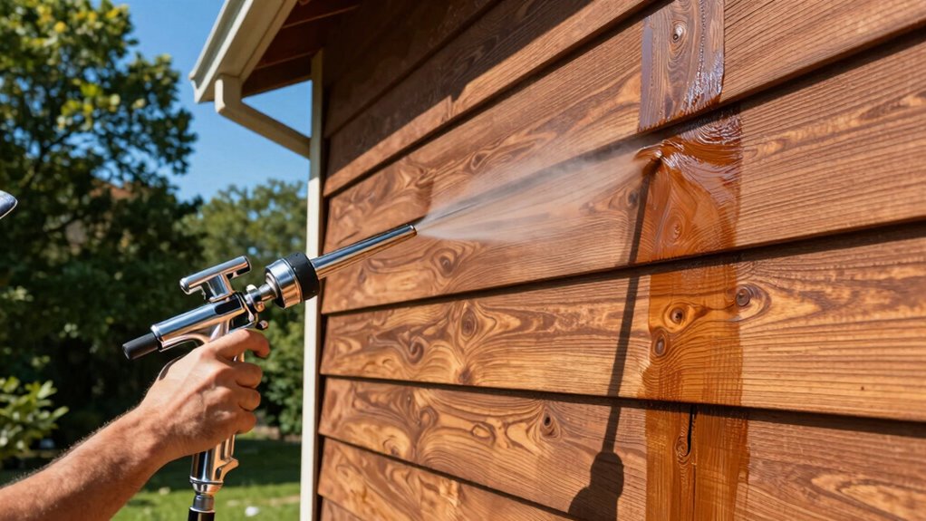 Choosing the right spray power and pressure is vital for achieving a smooth, even stain on cedar siding. Higher PSI allows better penetration and coverage, especially on textured surfaces. Typically, a range of 1500 to 3000 PSI works well for staining cedar, providing even coats without causing overspray. If the pressure is too low, you risk uneven application and missed spots, while excessive pressure can lead to paint blowback and waste. Adjustable pressure controls give you better precision, especially on uneven or detailed surfaces. Maintaining consistent pressure throughout your project is fundamental for a uniform finish. By selecting a sprayer with appropriate power and adjustable settings, you guarantee optimal coverage, efficiency, and a professional-looking stain on your cedar siding.