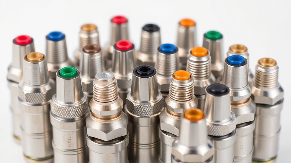 Selecting the right material for your spray tips considerably impacts their durability and performance over time. High-quality materials like tungsten steel or stainless steel are essential because they resist wear and maintain their shape through heavy use. Durable plastics and corrosion-resistant metals help prevent damage from various coatings and environmental exposure. The construction of the nozzle, including reinforced seals and sturdy tips, also plays a critical role in longevity and leak-proof operation. Reversible spray tips made from tough materials make cleaning easier and reduce the risk of damage from frequent use. Ultimately, material choice affects the tip’s ability to withstand high pressure and abrasive coatings, directly influencing how long your tools last and how much maintenance they need.