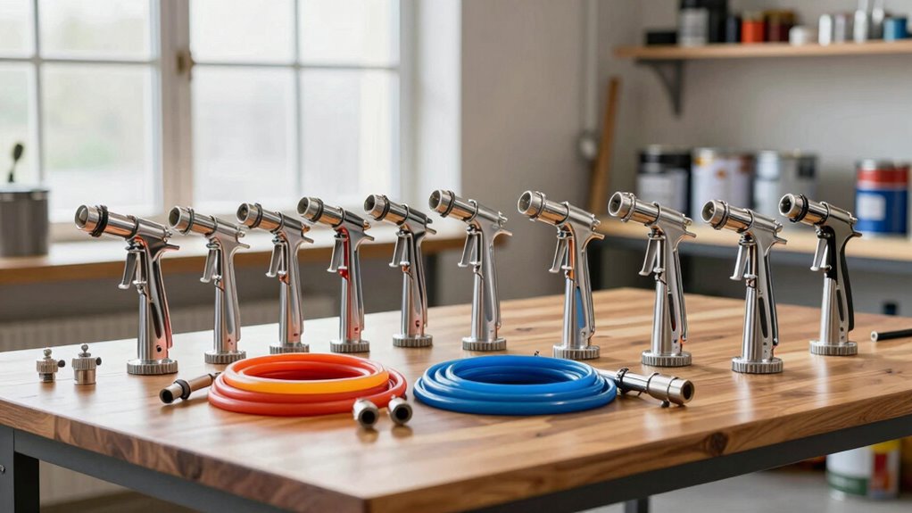When choosing an airless sprayer for high build primer, I focus on key factors like pressure range, nozzle compatibility, and spray pattern control to guarantee the best results. Pump power, speed, hose length, and flexibility also play vital roles in making the job efficient and manageable. Understanding these points helps me select a sprayer that matches my project needs perfectly.