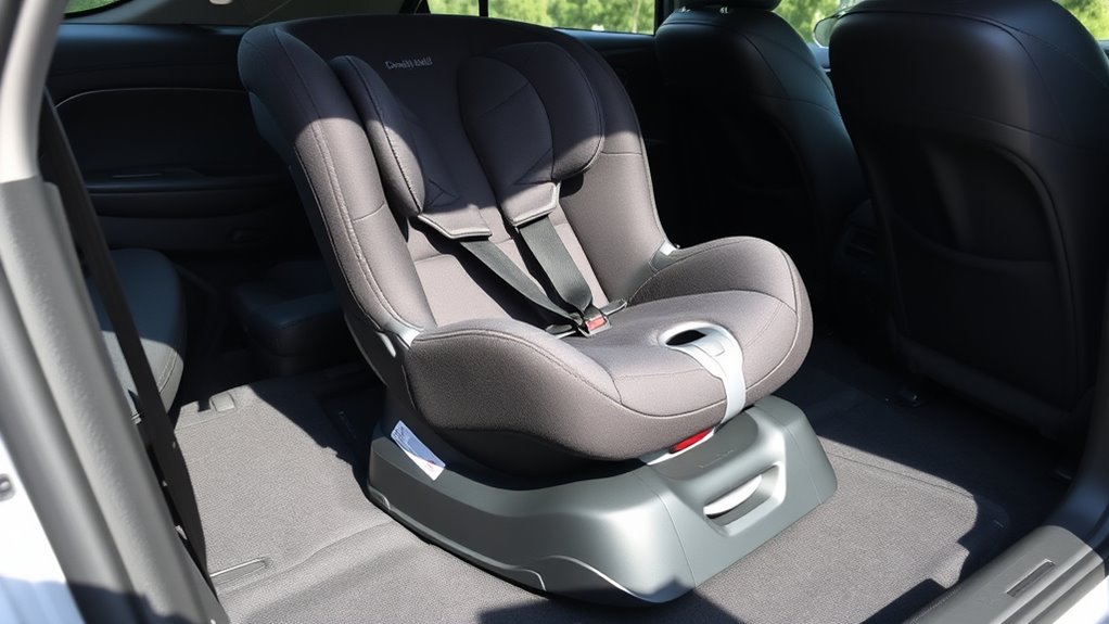 Choosing a convertible car seat with a load leg can considerably enhance your child’s safety by stabilizing the seat during a crash. Load legs extend from the base of the seat to the vehicle floor, helping to reduce rotation and distribute crash forces more evenly. Research shows that seats with load legs can cut rotational forces by up to 50%, which greatly boosts safety. To maximize these benefits, the load leg must be securely anchored, so proper installation is essential. Regularly inspecting and maintaining the load leg ensures it continues to provide ideal stability and protection. When selecting a seat, look for a sturdy, well-designed load leg that fits your vehicle, as this directly impacts its effectiveness in protecting your child during collisions.