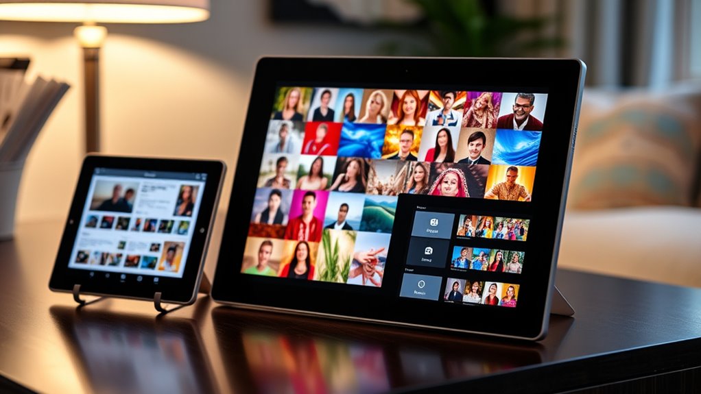 A high-quality screen resolution is essential for ensuring your photos look sharp and vibrant. A resolution of 1280×800 or higher provides crisp details and vivid colors, making your images stand out. Lower resolutions can make photos appear pixelated or blurry, diminishing their impact. For the best viewing experience, choose a screen with an IPS panel, which offers wider angles and more accurate color reproduction than TN or VA panels. It’s also important to match or exceed your photo’s original resolution to avoid pixelation. Keep in mind that larger screens with high resolution deliver more immersive and crisp visuals. Ultimately, a higher resolution enhances the overall display quality, ensuring your photos look their best when uploaded via email.