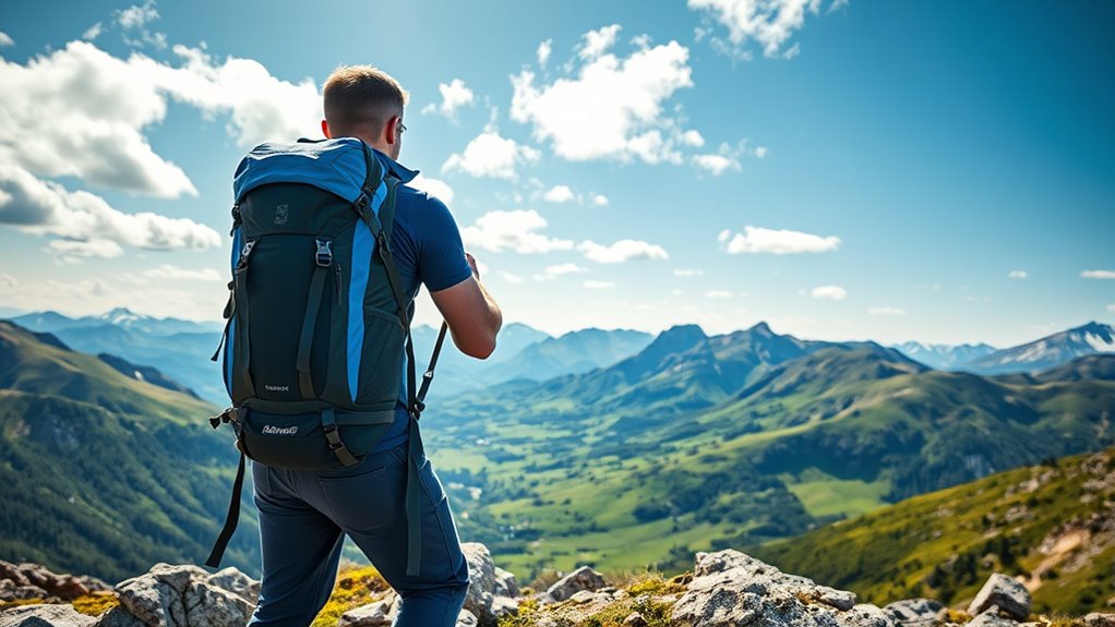 A well-fitting backpack can make all the difference on a hike, as comfort directly impacts your endurance and enjoyment. Adjustable padded shoulder straps and ergonomic back panels help reduce fatigue during long treks, while breathable mesh padding on straps and back keeps you cool and dry. A good fit distributes weight evenly across your shoulders and hips, minimizing pressure points and boosting stability. Chest and waist straps secure the pack tightly, preventing shifting and improving comfort. Properly contoured, lightweight designs decrease strain on your back and shoulders, making extended wear more manageable. When choosing a backpack, prioritize these features to guarantee maximum comfort, especially on those challenging, longer hikes where every ounce of support counts.