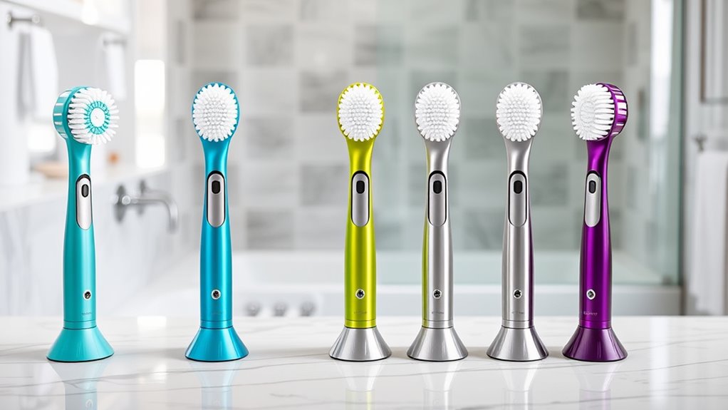 Waterproofing and durability are key factors I consider to make certain my electric spin scrubber can handle the demands of wet environments. An IPX7 waterproof rating is ideal, meaning the device can be fully submerged for up to 30 minutes without damage. I look for scrubbers made from high-quality plastics and stainless steel, as these materials improve longevity and resist corrosion. A waterproof design prevents electrical short circuits and keeps internal components safe. Features like a sealed motor and water-resistant casing are vital for lasting performance. Additionally, regular maintenance, such as rinsing brush heads, helps maintain waterproof integrity and extends the device’s lifespan. These factors give me confidence that my scrubber will perform reliably during tough, water-heavy cleaning tasks.