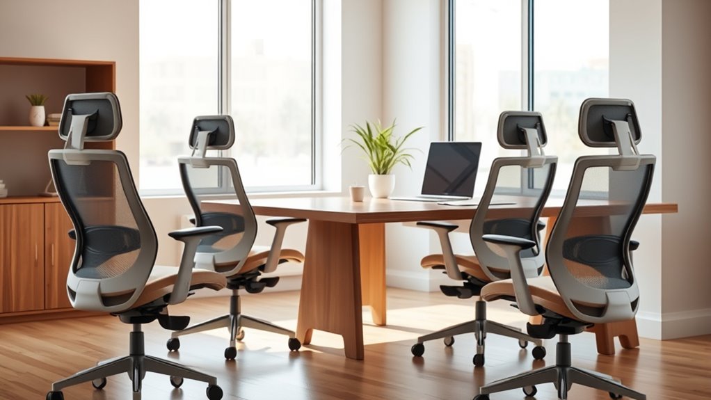Ever wonder why some office chairs stay comfortable even after hours of use? It’s often due to breathable materials like mesh that allow air to circulate, preventing heat buildup and moisture. These options help keep you cool, especially in warmer climates or heated offices, making long sitting sessions more tolerable. High-quality breathable fabrics resist deformation and wear, ensuring durability over time. Enhanced airflow reduces sweating and discomfort, helping you stay focused and productive. Choosing an ergonomic chair with breathable surfaces also supports better posture by preventing overheating and promoting proper alignment. Overall, breathable material options are a key factor in maintaining comfort during extended periods at your desk, making your workday more pleasant and less fatiguing.