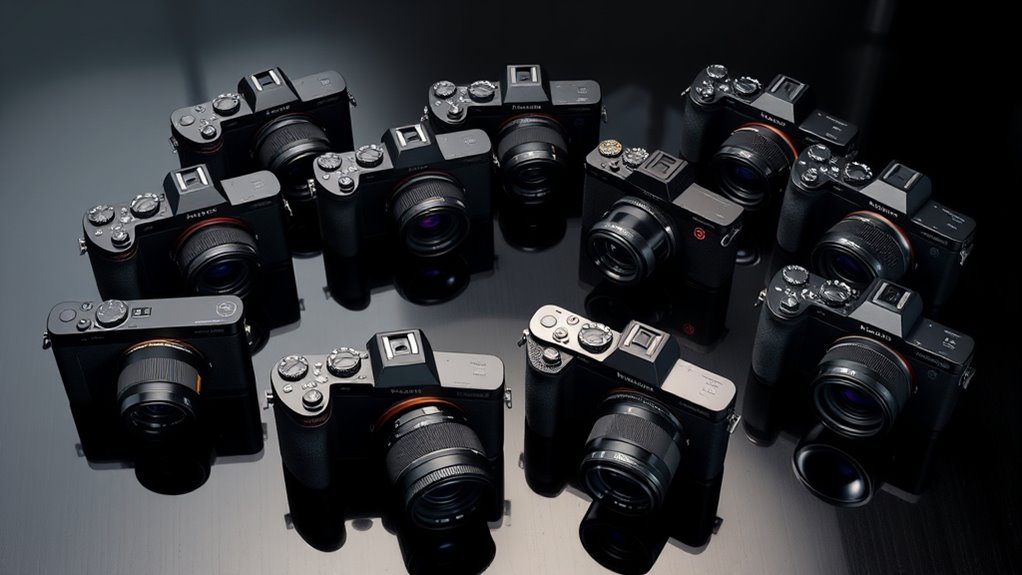 Did you know some full-frame mirrorless cameras weigh over 700 grams? I’ve found that ergonomic design and weight really matter during long shoots. Lighter models reduce fatigue, making extended sessions more comfortable, while bulkier ones offer better grip and stability. So, if you’re planning all-day shoots, I recommend balancing weight with comfort to avoid strain. It’s all about finding what feels best for your shooting style.