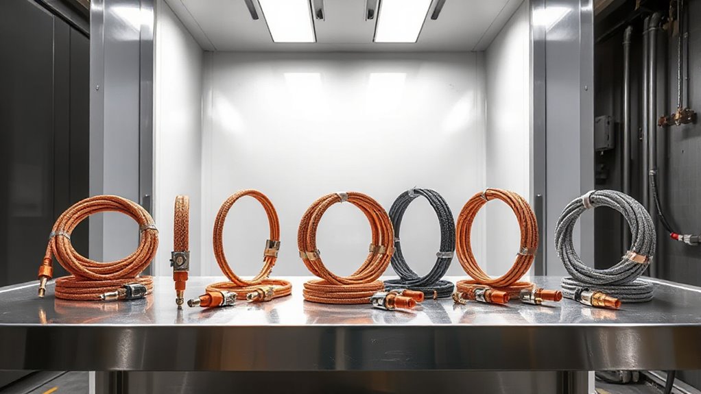Have you ever considered how the length of grounding cords impacts the effectiveness of your spray booth’s static control? The right length guarantees all critical areas are properly grounded, typically ranging from 15 to 40 feet. Longer cords offer greater flexibility, allowing equipment and personnel to move freely without disconnecting. However, excessively long cords can increase resistance, potentially reducing grounding effectiveness if not designed with proper resistors. The ideal length depends on your booth’s size and layout, ensuring thorough coverage without excess slack. Using appropriately sized cords helps maintain a safe, reliable static discharge path, minimizes clutter, and reduces tripping hazards. Ultimately, selecting the correct cord length balances functionality with safety, ensuring consistent static control during operations.