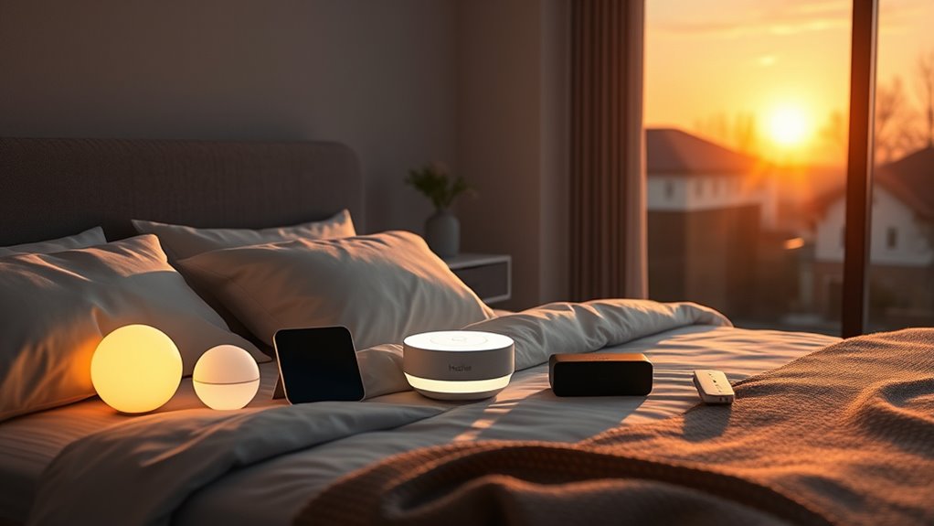 A device that’s easy to use can make a big difference in your bedtime routine, especially if you want to avoid frustration or confusion. I look for products with intuitive controls that require minimal setup and operate smoothly without needing technical expertise. Simple, single-button or minimal-touch interfaces help me make quick adjustments without hassle. Compatibility with a companion app or remote control should be straightforward to navigate and set up, so I can customize settings easily. Clear instructions and responsive customer support are essential—they make troubleshooting simple and boost confidence in the device. Automatic features like preset routines or sleep schedules also improve usability by reducing effort and ensuring I stick to a relaxing bedtime routine. Ease of use keeps my evenings stress-free and more enjoyable.