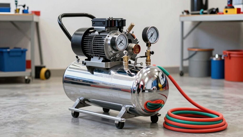 A larger tank size plays a crucial role in ensuring consistent performance during sanding and spraying tasks that demand high CFM airflow. It provides a greater reserve of compressed air, allowing continuous operation without frequent interruptions. I recommend a tank capacity of at least 10 gallons for these tasks, as it helps maintain stable air pressure and prevents pressure drops. Bigger tanks also reduce the frequency of compressor cycling, which lessens wear and tear on the motor and extends the compressor’s lifespan. The tank volume directly impacts how long you can operate your tools before needing to pause for refilling. For high CFM applications, choosing a compressor with a sufficiently large tank is essential for efficient operation, stable airflow, and consistent work quality.