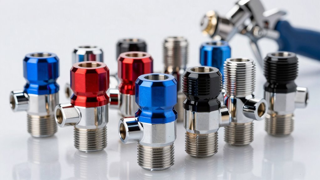 Durability is a key consideration when picking high flow air fittings for spray painting, as these components must withstand daily use and environmental stressors. Choosing fittings made from materials like brass, steel, or anodized aluminum ensures they resist corrosion and wear, extending their lifespan. Brass fittings offer excellent corrosion resistance and handle high-pressure applications well, making them ideal for spray painting setups. Steel fittings, especially those with zinc plating or anodized coatings, provide added strength and durability in demanding environments. Aluminum fittings are lightweight yet strong, with anodized finishes that resist scratches, dulling, and environmental damage. Selecting high-quality fittings with protective coatings guarantees consistent high flow performance and reduces the frequency of replacements, saving time and money in the long run.