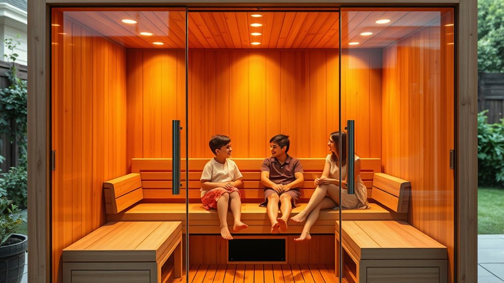 The materials used in an infrared sauna play a essential role in its durability, insulation, and overall appearance, especially for families sharing the space. Choosing high-quality woods like Canadian Hemlock or reforested varieties ensures longevity and aesthetic appeal. Thick wood planks, typically 6mm to 8mm, are necessary for effective heat retention and structural strength. For outdoor models, weather-resistant woods such as Mahogany or Hemlock are better suited to withstand moisture and temperature fluctuations. Additionally, sturdy tempered glass panels enhance safety and contribute to the sauna’s durability. Proper construction, including excellent insulation and secure panel assembly, is indispensable for maintaining structural integrity over time. These material choices directly impact how well the sauna performs and withstands the test of time in busy family environments.