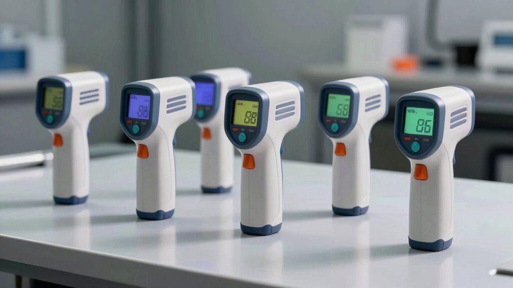 Infrared thermometers are quite accurate for paint curing at close distances—usually within a few inches—providing readings within 1-2°F. As I increase the distance, accuracy can drop slightly due to environmental interference and the device’s spot size, which affects precision. For best results, I recommend keeping the thermometer close and ensuring a clear line of sight. Proper calibration and understanding the device’s limitations help maintain accuracy at various distances.
