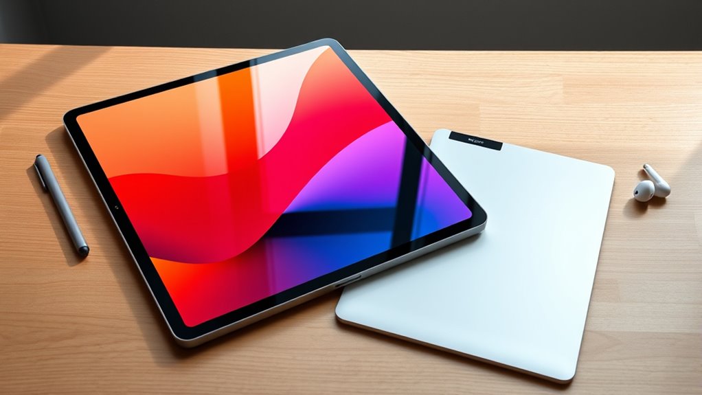 Choosing between the iPad Pro 2025 and iPad Air isn’t just about price; it’s also about how well each device supports the accessories and features you’ll rely on daily. Both models should support essential accessories like the Apple Pencil and Magic Keyboard, which are indispensable for productivity and creativity. Checking compatibility with the latest iPadOS updates ensures you can maximize multitasking and creative tools. The USB-C connector type is essential for connecting external displays and high-speed data transfer, especially for academic projects. Security features like Touch ID are significant for secure login and payments, so verify which device offers the best fit. Ultimately, consider whether the device works seamlessly with your existing peripherals, making your workflow smooth and efficient.