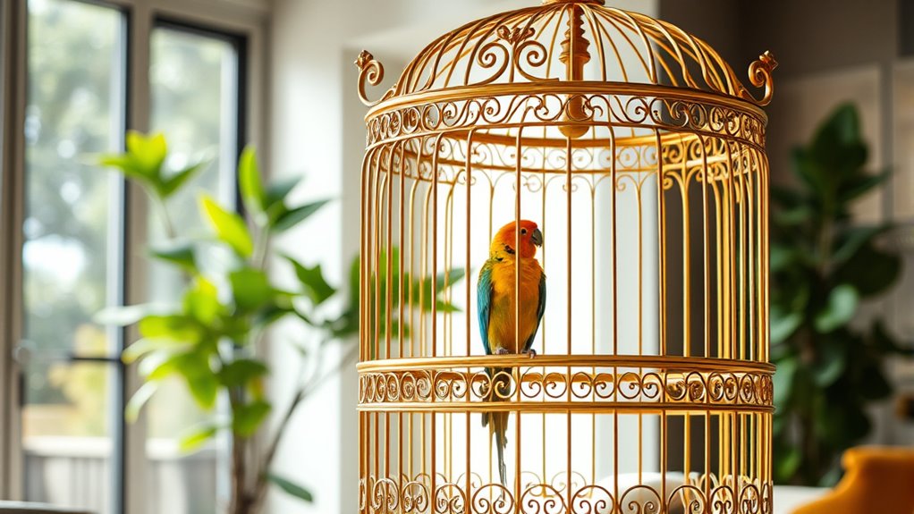 Ever wonder how the design of a luxury bird cage can enhance your home’s decor while providing a stylish home for your bird? A well-designed cage should blend elegance with function, featuring decorative elements or unique shapes that complement your interior. High-quality finishes, like polished metals or painted surfaces, give it a refined look that elevates any room. Incorporating clear or decorative panels, such as glass or ornate wrought iron, not only improves visibility but also adds visual interest. Stylish cages often include artistic touches like intricate perches, custom feeders, or elegant stand designs that boost their aesthetic appeal. The overall color scheme and harmony with your environment play a significant role in creating a luxurious feel, making the cage a true statement piece.