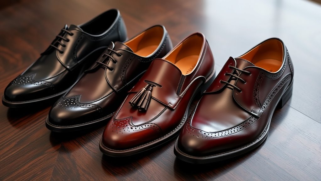 Selecting the right luxury men’s dress shoes depends on matching their style and formality to the occasion. For semi-formal events, sleek loafers or dressy derbies work well, while classic Oxfords are ideal for formal ceremonies. Consider the material and design features appropriate for the setting—patent leather suits evening events, whereas suede is better for daytime or casual dress codes. Guarantee the shoe’s color and embellishments complement your outfit and adhere to the dress code. For longer events, opt for shoes with added comfort features like cushioned insoles or flexible construction. Ultimately, choosing shoes that align with the occasion’s level of sophistication ensures you look polished and appropriate, making a confident statement while respecting the event’s tone.