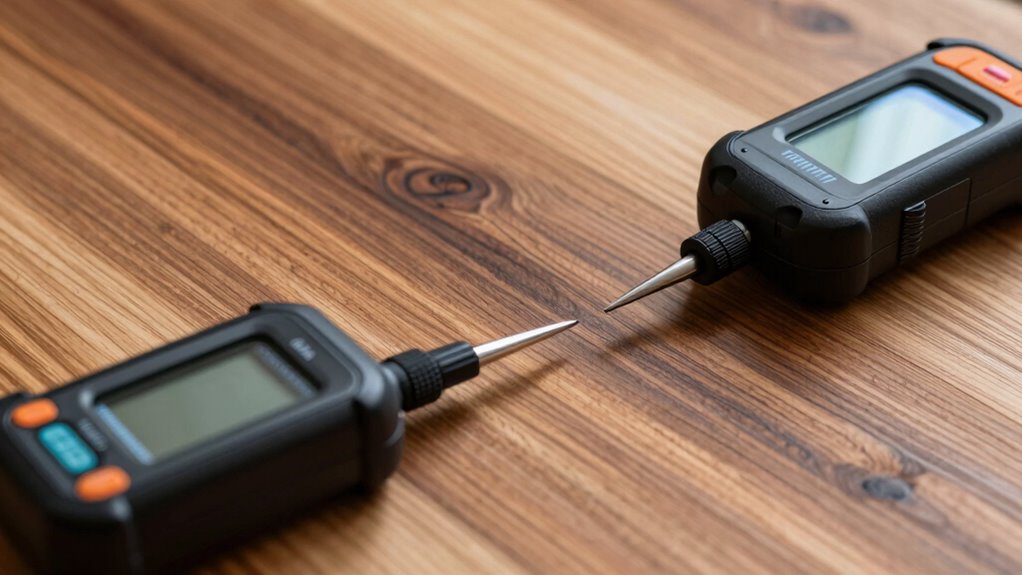 Absolutely, moisture meters can detect hidden internal moisture, but it hinges on the type you use. Pin-type meters penetrate the surface, revealing internal moisture levels, while pinless models scan deeper without damage. I always recommend using a pin-type if you’re concerned about hidden moisture, as it gets right to the core. Think of it as a way to see behind the curtain and ensure your wood’s truly ready for paint.