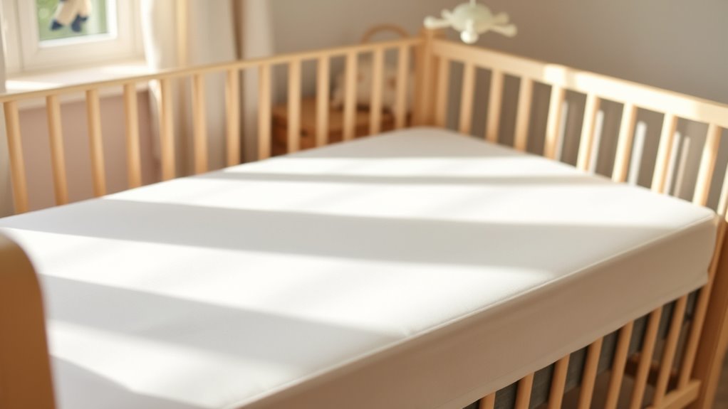 When choosing a non-toxic crib mattress, considering its waterproof and cleanability features is essential for maintaining a hygienic sleep environment. A waterproof mattress has a protective surface that resists spills, stains, and accidents, making cleanup easier. Many non-toxic options use natural materials like organic cotton with sugarcane-derived coatings or innovative, breathable fabrics free of harmful chemicals. Easy-to-clean mattresses allow quick wiping with soap and water, reducing reliance on harsh cleaning agents. Removable, washable covers are also a great feature, helping eliminate dust mites, allergens, and bacteria over time. Opting for a breathable, waterproof surface ensures safety and hygiene without trapping heat or off-gassing toxic chemicals. These features help keep your baby’s sleep space clean, safe, and comfortable.