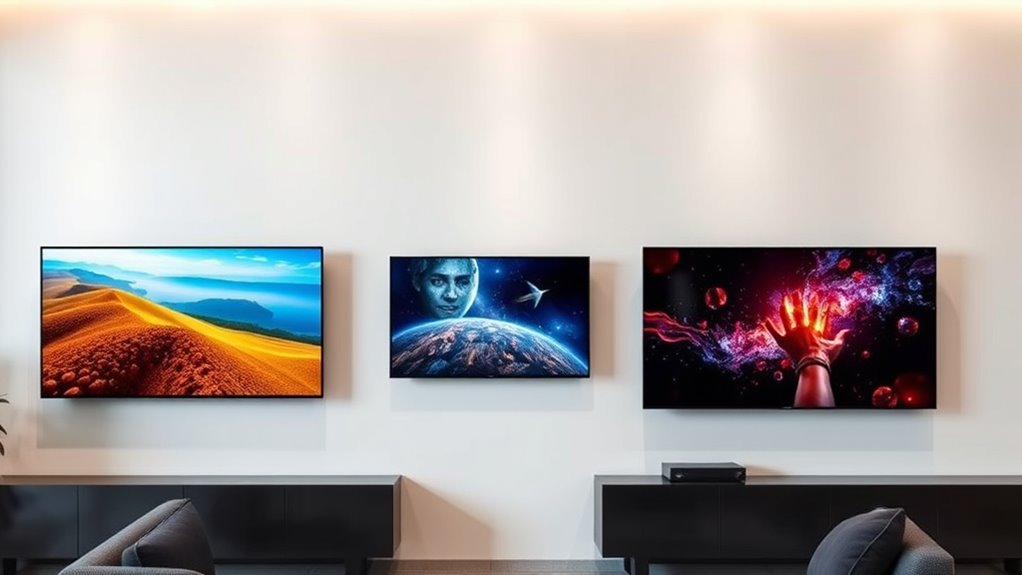 Great audio quality can transform your viewing experience, so it’s crucial to pay attention to a TV’s sound features. High-quality OLED TVs often include built-in Dolby Atmos or similar surround sound tech, creating immersive audio that complements stunning visuals. Many models also feature AI-enhanced sound processing, automatically adjusting to content for clearer dialogue and richer depth. For an even more multidimensional experience, look for models with multiple speakers or soundbars, like those with Wow Orchestra technology. Advanced audio formats such as Dolby Vision and Dolby Atmos can elevate your home theater sound to new heights. Additionally, consider TVs with acoustic tuning or sound optimization features, which improve overall clarity and balance. These sound enhancements can make all the difference in enjoying your favorite shows and movies fully.