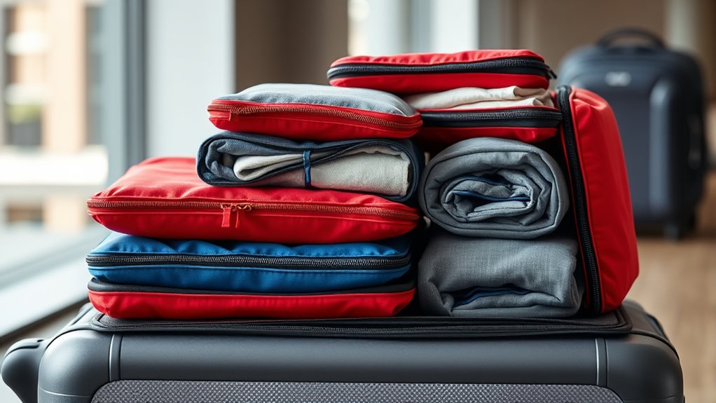 Think of compression cubes as tiny breathers for your clothes, squeezing out excess air like a balloon deflating. I use them to flatten and compact my belongings, turning bulky stacks into sleek, space-saving bundles. By pressing out air and reducing volume, these cubes make room for more essentials. They transform chaos into order, allowing me to pack smarter and travel lighter without sacrificing what I need most.