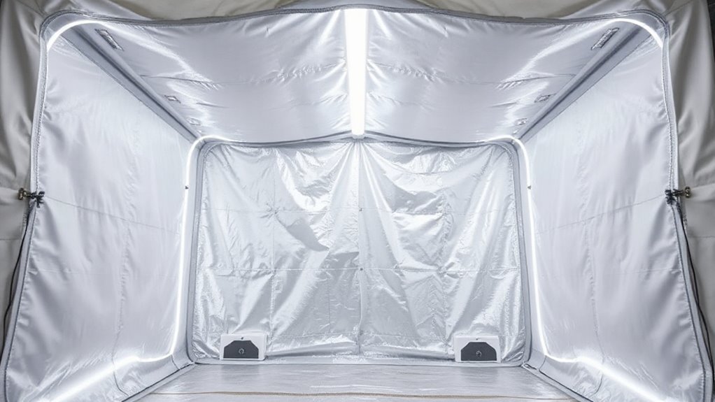 Effective temperature control in a paint curing tent is essential for achieving consistent, high-quality results. I look for tents with built-in heating systems, portable electric heaters, or insulation materials like reflective coatings and foam panels that help maintain ideal curing temperatures. Advanced models offer temperature sensors and automated thermostats, allowing me to regulate heat precisely. Consistent temperatures speed up curing times, which is a big plus for efficiency. I also pay attention to ventilation, ensuring it’s balanced with heating to prevent overheating and promote even heat distribution. Proper insulation and temperature regulation work together to keep the internal environment stable, reducing the risk of uneven curing or defects. This control is vital for achieving professional finishes and maximizing productivity during the painting process.