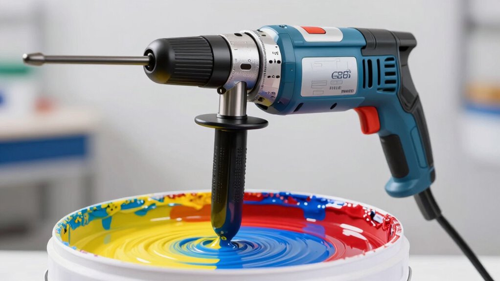 Think of these drills as the dependable workhorses of your toolkit—they can handle thick or latex paints with ease. I’ve used them myself, and they effortlessly blend even stubborn, heavy paints without overheating or stalling. Just guarantee you select a drill with a high torque setting and a robust mixing paddle. That way, you’ll get a smooth, consistent mix every time, saving you headaches and time.