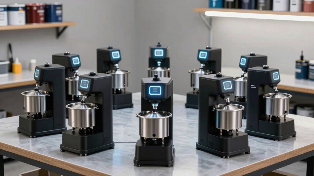 Safety features are the backbone of these paint shakers, and let me tell you, they’ve got your back. Most models include automatic shutoff, non-slip bases, and secure lids to prevent accidents. Some even have overload protection and emergency stop buttons for extra peace of mind. These features guarantee you can focus on your project without worrying about mishaps. Safety first, always—because a prepared shop is a happy shop.
