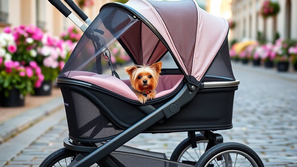 Safety features are essential to guarantee your small dog stays secure and protected during every ride. I look for strollers with brakes on the wheels to prevent unintended movement, especially on slopes or uneven terrain. Mesh panels and zippers are crucial for keeping your pet from escaping or jumping out, giving peace of mind. Lockable front wheels improve stability and maneuverability, particularly when turning or steering through rough surfaces. Inside, safety harness attachments or clip-in points ensure your dog stays securely in place, reducing fall risks. Additionally, a sturdy frame made from reinforced materials helps maintain the stroller’s integrity, preventing collapses or structural failures. These features work together to keep your small dog safe, comfortable, and secure during every outing.