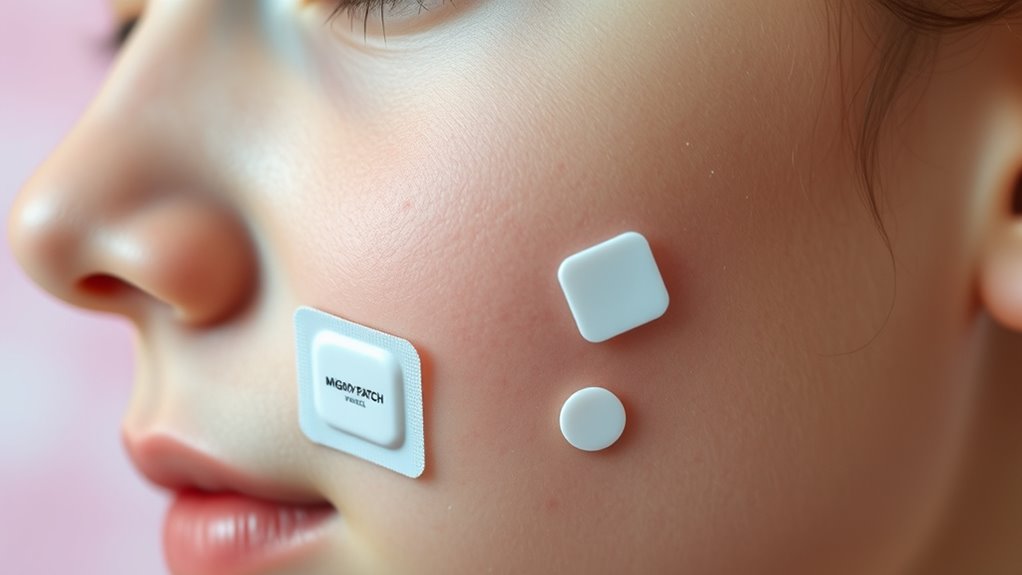 If you have sensitive skin, it’s crucial to choose pimple patches carefully to avoid irritation or allergic reactions. Look for labels that say hypoallergenic and check ingredient lists for potential irritants like fragrances, dyes, or certain adhesives. Ingredient sensitivity varies from person to person, so some patches with adhesives or hydrocolloid materials might cause reactions in some teens. To be safe, test a small skin patch before applying it to your face to see if any adverse reaction occurs. Patches with soothing ingredients like aloe vera or chamomile can be gentler options for sensitive skin. Always read product warnings and ingredient lists thoroughly to avoid components that might trigger allergies or sensitivities, ensuring your skin stays calm and irritation-free.