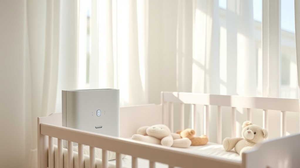 I recommend replacing filters in nursery air purifiers every 6 to 12 months, depending on usage and the manufacturer’s guidelines. If you notice decreased airflow or a musty smell, it’s a good sign the filter needs changing sooner. Regularly checking and maintaining the filters guarantees your baby’s air stays fresh and safe, especially if they have allergies or asthma. Staying on top of filter replacements is key to a healthy nursery environment.