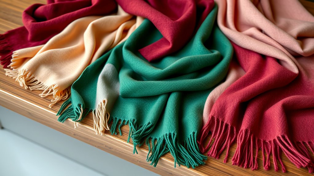 The size of a cashmere scarf plays a significant role in how versatile it can be, influencing the various ways you can wear it. Larger scarves, over 80 inches long, provide more styling options, like wrapping multiple times or draping for elegance or warmth. These are perfect for formal events or cozy layering. On the other hand, narrower or shorter scarves are ideal for everyday casual wear, offering a sleek look without sacrificing comfort or warmth. Multi-purpose scarves are especially valuable—they can serve as a neck wrap, shawl, or even a small blanket, making them great for travel or layering. Ultimately, a versatile cashmere scarf balances generous dimensions with manageable weight, ensuring you get both style and comfort in one accessory.