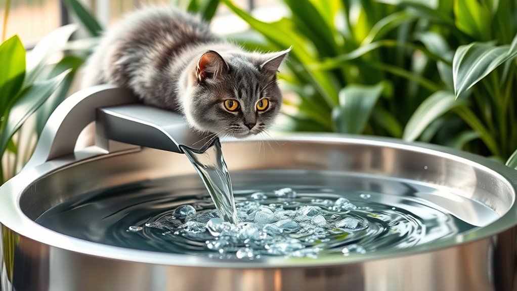 These premium cat fountains are surprisingly energy-efficient. I’ve noticed they use minimal power because many feature quiet, low-watt motors and energy-saving modes. They’re designed to run smoothly without consuming much electricity, which is great for both my budget and the environment. Plus, their efficient operation means I don’t have to worry about high energy bills, making them a smart choice for keeping my cat hydrated without wasting energy.