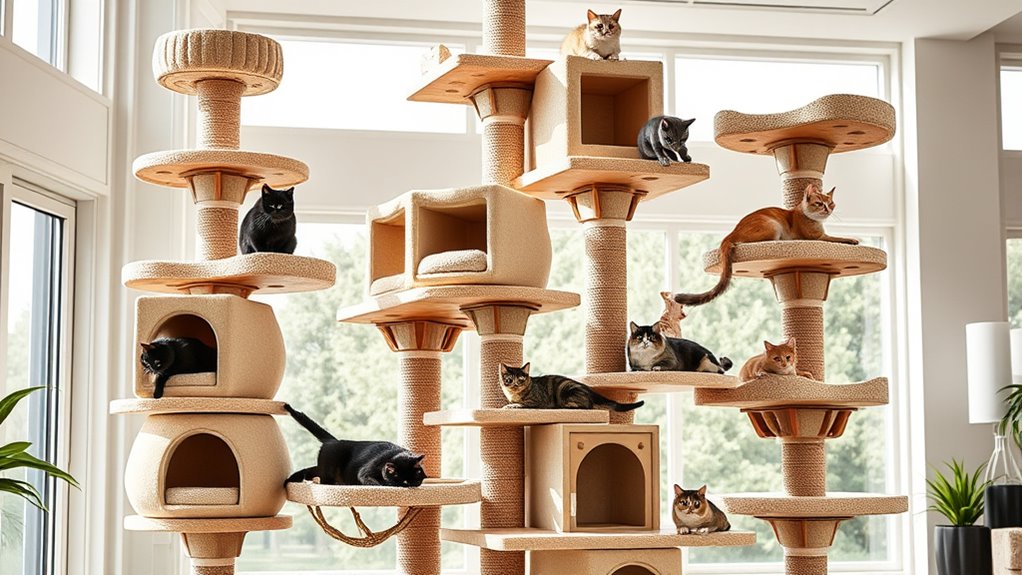 If you’re looking for the best premium cat trees and condos, I’ve got you covered. I’ve researched stylish, sturdy options with multiple levels, cozy hideouts, scratching posts, and space for all your cats to play and rest comfortably. These structures support larger cats and fit various home spaces, adding both function and flair. Keep going to discover detailed reviews and key features of top models that will transform your cat’s environment.