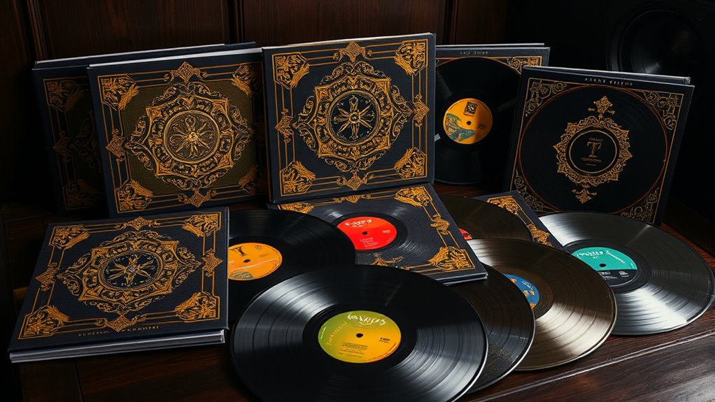 If you’re looking for the best premium collector’s edition vinyl sets, I’ve got some great options for you. From vibrant multi-colored anthologies like The Grateful Dead’s VMP collection to exclusive releases like MF DOOM’s silver anniversary box and iconic soundtracks, these sets combine stunning artwork, superior sound quality, and limited editions that boost their value. If you keep exploring, you’ll discover even more details that can elevate your collection.