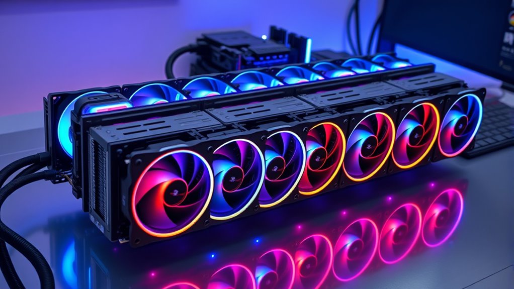 Achieving ideal system airflow is vital for maximizing the cooling performance of premium CPU coolers during overclocking. Proper airflow balance ensures cool air reaches the CPU and hot air is effectively expelled, keeping temperatures in check. Strategic placement of intake and exhaust fans prevents hotspots and promotes uniform airflow across the motherboard and components. High static pressure fans are crucial for pushing air through dense heatsinks and radiators, especially with increased heat output from overclocked CPUs. Maintaining positive pressure within the case helps minimize dust buildup and sustains consistent airflow, which is essential for stability. Additionally, good cable management and case ventilation design avoid obstructions, guaranteeing that cool air reaches the CPU cooler efficiently and hot air escapes smoothly. Proper airflow is key to unlocking maximum overclocking potential.