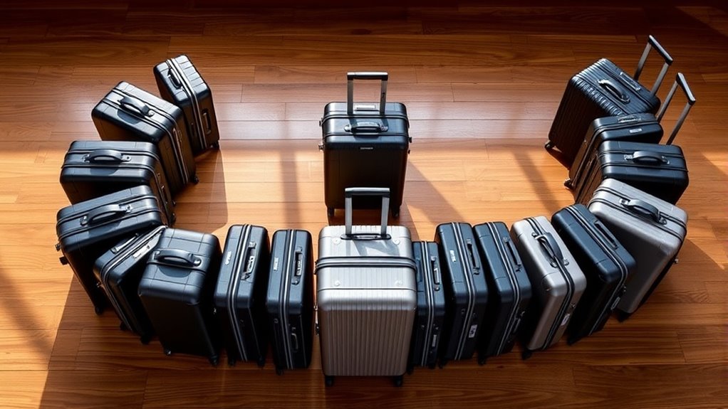 Choosing the right size for your expandable suitcase set is essential to avoid surprises at the airport. I always check that the dimensions meet airline restrictions, typically around 22 x 14 x 9 inches for carry-ons. It’s also important to verify the expandable capacity, so I can pack extra without exceeding weight limits. For short trips, a 20-inch suitcase usually suffices, while longer journeys call for a 28-inch option. I pay close attention to each size’s weight to ensure easy handling and compliance with airline rules. Since airline policies vary, I review specific route restrictions to avoid surprises during check-in. Matching your suitcase size to your travel duration and airline requirements ensures a smooth, stress-free journey every time.