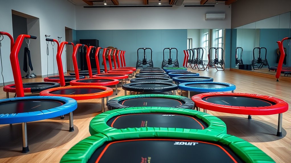 A well-built frame provides a sturdy foundation, but the ability to customize bounce response truly elevates a fitness trampoline set. Many premium models feature adjustable tension settings, letting you fine-tune bounce firmness for different workout intensities. Elastic cords or bungees with multiple tension levels enable tailored rebound experiences, from soft and gentle to vigorous bounces. Some trampolines even have adjustable spring or elastic cord systems that can be modified easily to increase or decrease bounce height without tools. This flexibility enhances workout versatility, accommodating users with varying fitness levels and preferences. Plus, customizable tension mechanisms help optimize comfort, safety, and effectiveness, ensuring you get the most out of your workout while maintaining control over bounce responsiveness.