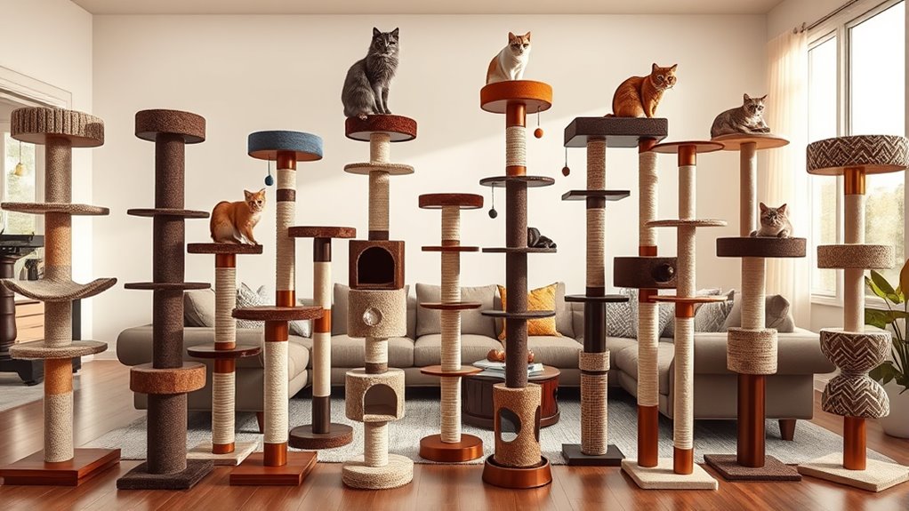 Selecting the right size and height for a luxury cat scratching post guarantees your feline has plenty of space to stretch and play comfortably. Ideally, a post should be between 30 to 36 inches tall to allow cats to fully extend their bodies, promoting natural stretching and effective claw maintenance. Taller posts encourage active scratching and climbing, which helps reduce furniture damage. For larger or highly active cats, a post at least 34 inches tall provides enough room for vigorous activity. Shorter posts under 30 inches might not support full-body stretching, making them less appealing or effective. Consider adjustable or multi-level posts, which can accommodate different sizes and activity levels, ensuring your cat stays engaged and comfortable in their play space.