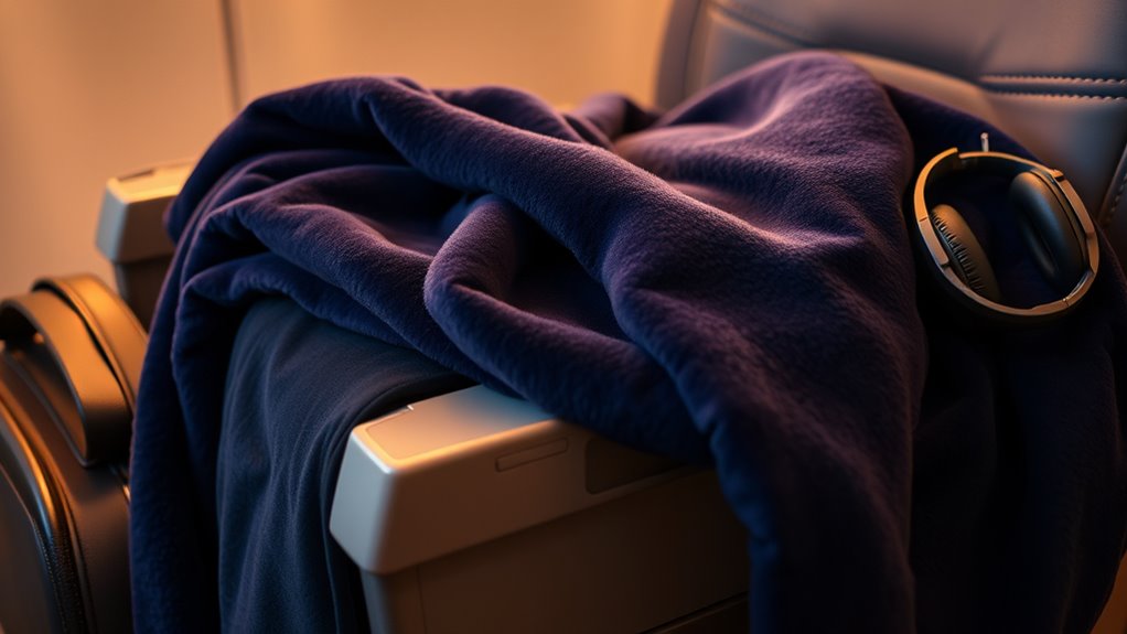 Think of travel blankets as your personal climate control. Yes, many offer temperature regulation features, adjusting to keep you comfy no matter the environment. They often use innovative fabrics that wick away moisture and trap heat, so you stay cozy without overheating. This makes them perfect for long flights, helping you maintain a steady, pleasant temperature. I’ve found these features turn a simple blanket into a smart travel companion, enhancing your journey.