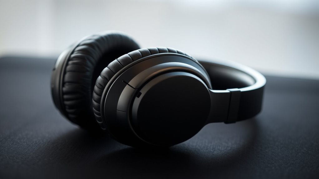 When selecting premium wireless noise-canceling headphones, comfort and fit are essential for enjoying extended listening sessions without discomfort. An ergonomic design with adjustable headbands and soft ear cushions helps guarantee a secure, personalized fit. Over-ear models with memory foam padding distribute pressure evenly, reducing fatigue during long use. Lightweight construction, typically under 200 grams, minimizes strain, allowing me to wear them all day without discomfort. Proper earcup size and shape, like oval or plush cushions, prevent soreness and accommodate various head sizes and ear shapes. Features such as pressure-relieving headbands and breathable materials further enhance comfort by reducing pressure points. Prioritizing these factors ensures the headphones stay comfortable, even during hours of continuous listening.