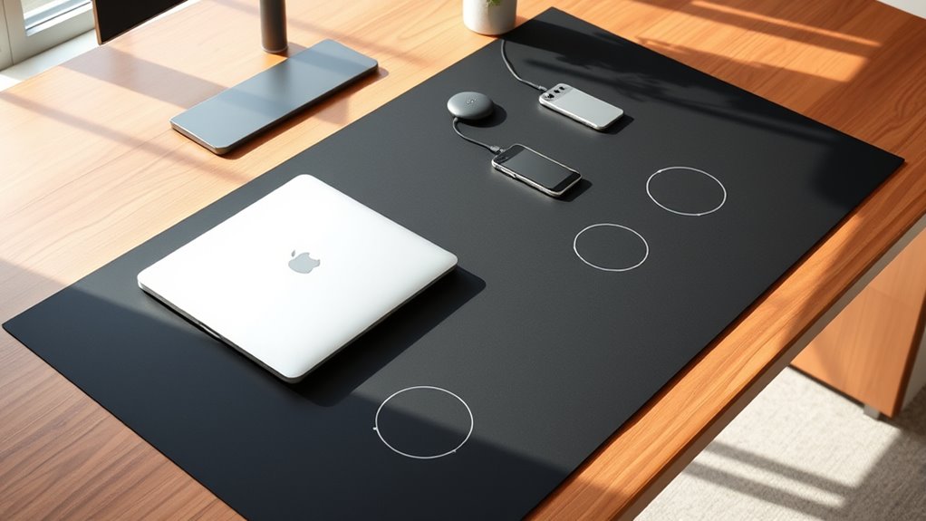 Since most wireless desk mats support up to 15W fast charging, understanding their charging speed is key to maximizing efficiency. This speed can markedly cut down charging times for compatible devices, especially when paired with a 9V/3A or higher power adapter. Keep in mind, the actual charging rate depends on the power supply and device compatibility. Some mats might charge slower or become inconsistent due to factors like device cases, improper placement, or hardware limitations. Features like multiple charging zones or magnetic alignment can improve device positioning, ensuring ideal power transfer. It’s crucial to verify that the wireless charging technology aligns with your device’s power needs to guarantee safe, fast, and reliable charging. Choosing a mat with the right power output helps maintain productivity and reduces workspace clutter.