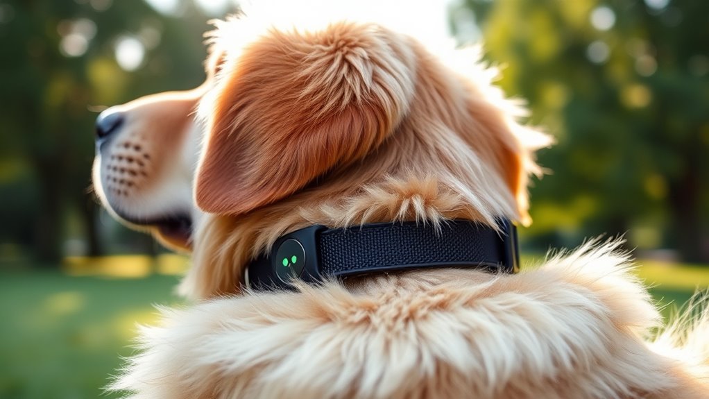 Choosing a smart dog collar with GPS means paying close attention to size and comfort fit to guarantee your pet stays comfortable and secure. It’s vital to select a collar that’s adjustable to fit your dog’s neck comfortably, typically from 8 to 30 inches. Opt for a lightweight design, ideally under 50 grams, to prevent any discomfort during long wear. Soft, non-toxic materials are key to avoid skin irritation or fur damage. Make sure the collar has secure fastening, like quick-release buckles, to prevent accidental loosening or removal. An ergonomic shape that conforms well to your dog’s neck helps prevent chafing and pressure points. Prioritizing these factors ensures your pup stays safe, comfortable, and happy while wearing their GPS collar.