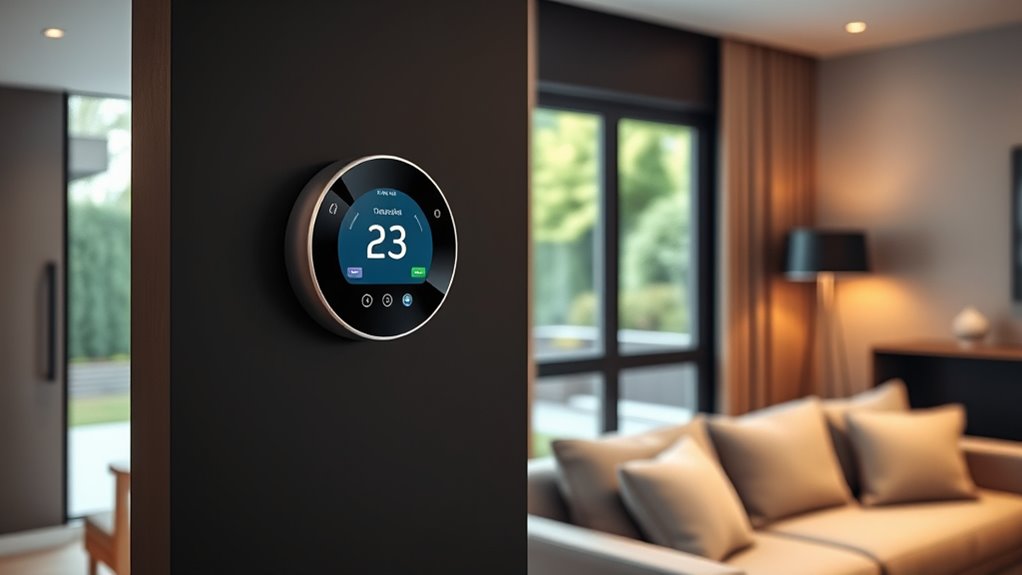 Smart thermostats adapt to different climate zones by utilizing location-based weather data and learning your habits. I program mine with local climate information, so it adjusts heating and cooling efficiently. Some models even analyze seasonal patterns over time, optimizing comfort and energy savings. This way, whether it’s a cold winter or a hot summer, my thermostat guarantees my home remains cozy or cool without wasting energy.