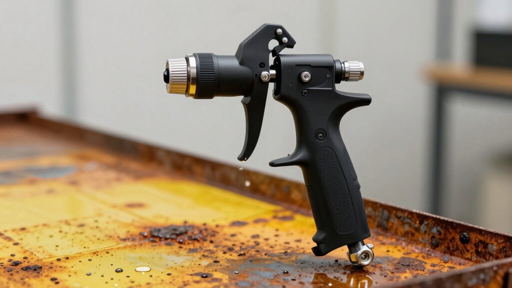 I find that a high-quality HVLP sprayer offers the best coverage for rust encapsulating paints. It provides a fine, even spray that minimizes overspray and guarantees thorough coating on rusted surfaces. I recommend models with adjustable pressure controls and a sizable paint cup, so you can work efficiently. Using an HVLP sprayer helps me achieve a smooth, professional finish while saving time and paint.