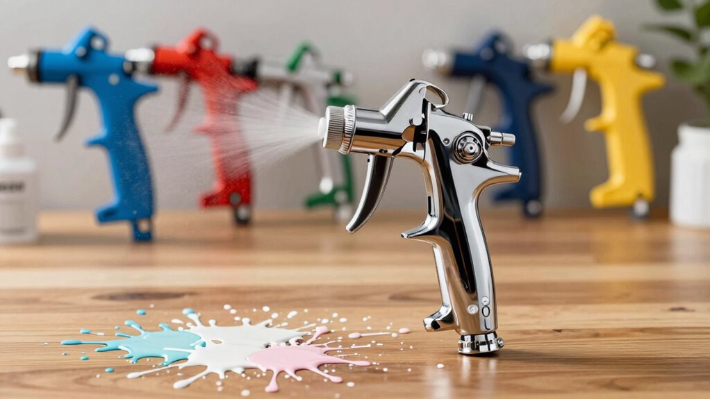I find that a fine-detail gravity feed spray gun offers the best control for detailed trim work. Its precision nozzle allows me to spray with accuracy, reducing overspray and ensuring a smooth finish. I prefer models with adjustable pressure controls so I can fine-tune the flow. This setup helps me achieve sharp lines and intricate details, making my work look professional and polished every time.