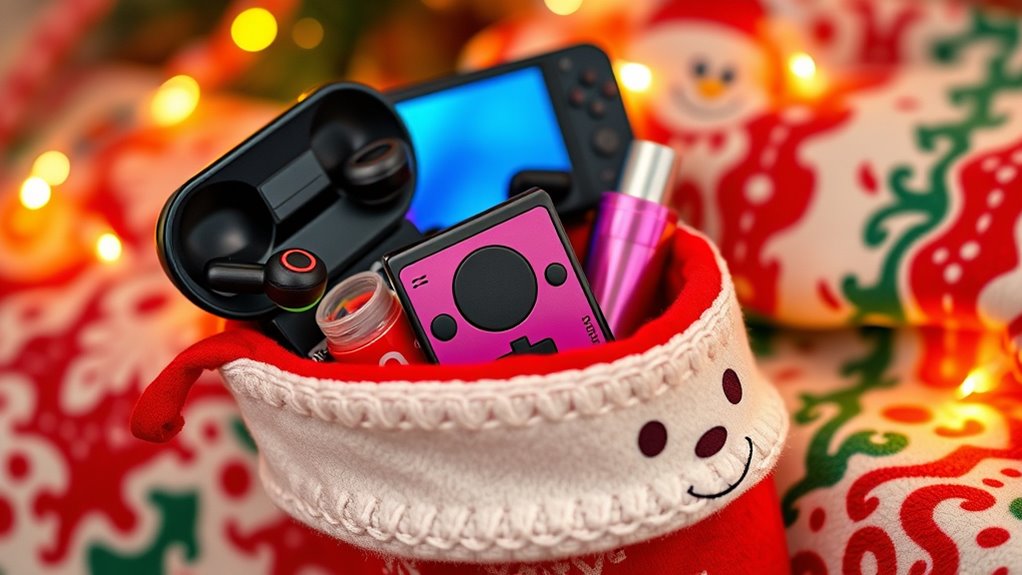 Think of stocking stuffers like tiny treasures that light up a teen’s day—each one a spark of joy in a sea of gifts. I remember how my niece’s face lit up when she found a quirky squishy cat in her stocking; it reminded me that sometimes, the smallest surprises create the biggest smiles. So, choose thoughtfully, and you’ll turn a simple gift into a cherished memory they’ll carry long after the holidays fade.