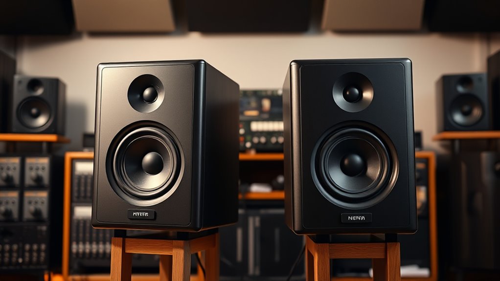 Did you know that nearly 80% of audio professionals say accurate sound is essential for great mixes? Choosing the right studio monitor can make all the difference in your music or projects. Whether you’re just starting out or upgrading your setup, investing in quality speakers guarantees you hear every detail clearly. So, pick what fits your space and needs—you’ll be amazed at how much better your sound becomes!