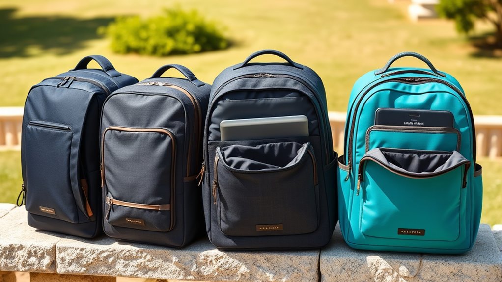 Think of security features as your backpack’s silent guardians. I’ve found that many top backpacks include lockable zippers, hidden compartments, RFID-blocking pockets, and cut-resistant materials. These elements work together like a fortress, deterring theft and safeguarding your valuables. When I travel, I prioritize these features because they give me peace of mind, knowing my belongings are protected—allowing me to focus on the journey instead of worrying about pickpockets.