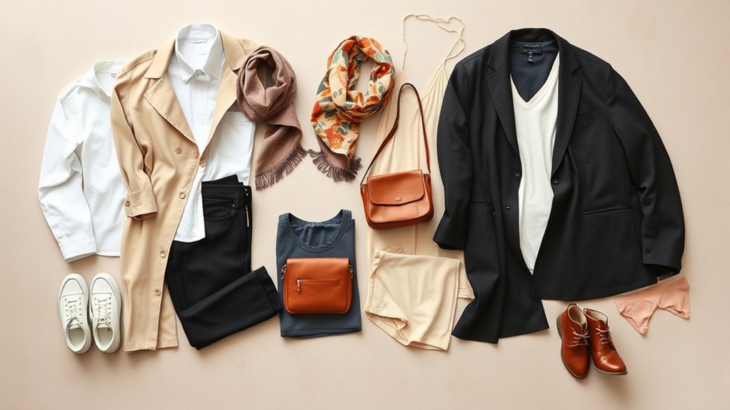 To maximize luggage space with capsule wardrobe items, I focus on versatile pieces that can mix and match easily. I fold clothes tightly and roll softer fabrics to save space and minimize wrinkles. I also choose lightweight, wrinkle-resistant fabrics and pack multi-purpose accessories. By limiting my wardrobe to essential, neutral-toned pieces, I keep my luggage compact and organized, making packing efficient and stress-free for any trip.