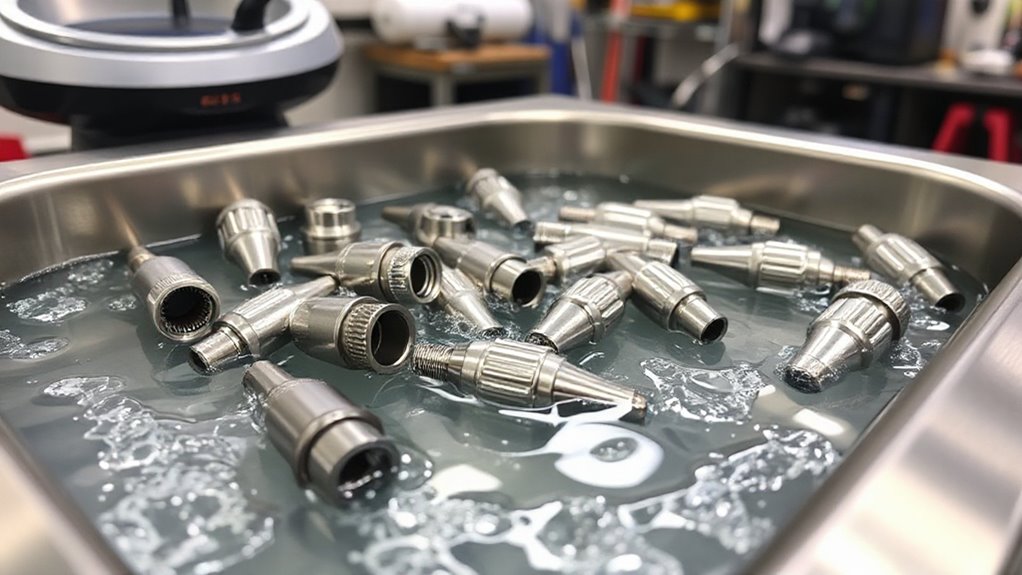 Imagine a tiny rescue squad diving into grime’s fortress—that’s how ultrasonic cleaners tackle clogged or hardened spray gun nozzles. They’re surprisingly effective, sending high-frequency waves that shake loose stubborn paint and debris. I’ve seen them work wonders, restoring nozzles to near-new condition. Just make certain you use the right cleaning solution and enough immersion time, and you’ll be amazed at how well ultrasonic cleaning can revive even the toughest blockages.